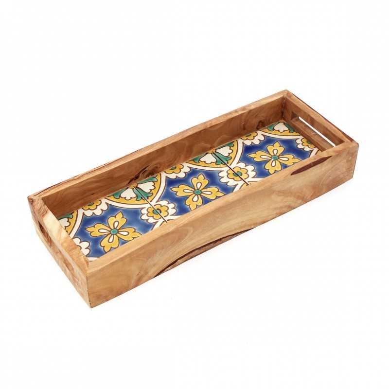 Plateau rectangulaire moyenne en bois d’olivier et faïence bleu/ jaune