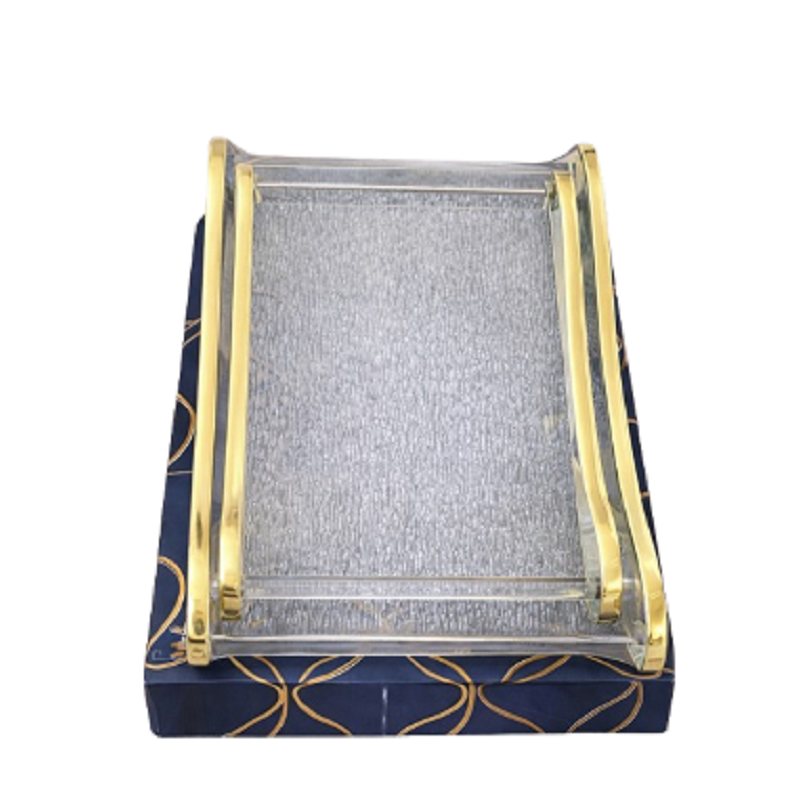 Deux Plateau pratique et élégant avec surface transparente et cadre doré. Idéal pour présenter gâteaux, fruits, boissons ou accessoires décoratifs.