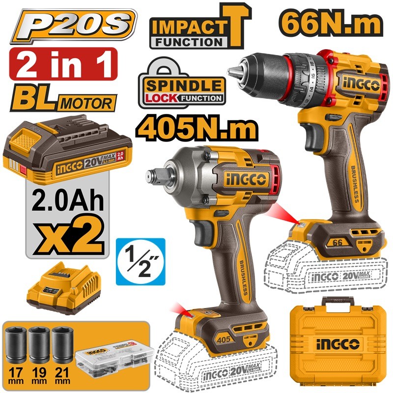 Kit combo 20V sans fil INGCO comprenant une perceuse à percussion brushless compacte (66 Nm, 30 000 bpm, mandrin 13 mm) et une clé à chocs brushless 1/2" (405 Nm / 555 Nm). Livré avec 2 batteries 2Ah, chargeur et 47 accessoires pour travaux complets de perçage et serrage.