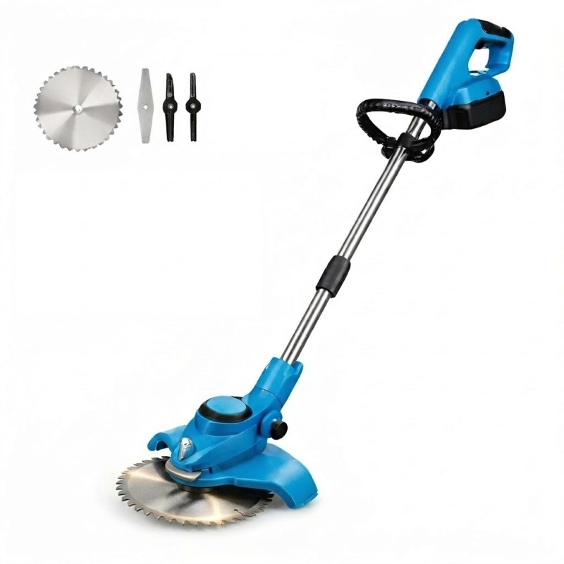 Débroussailleuse sans fil 88V portable idéale pour coupe de gazon, bordures et désherbage. Livrée avec lames plastique, métalliques et disque de coupe, plus 2 batteries rechargeables et chargeur.