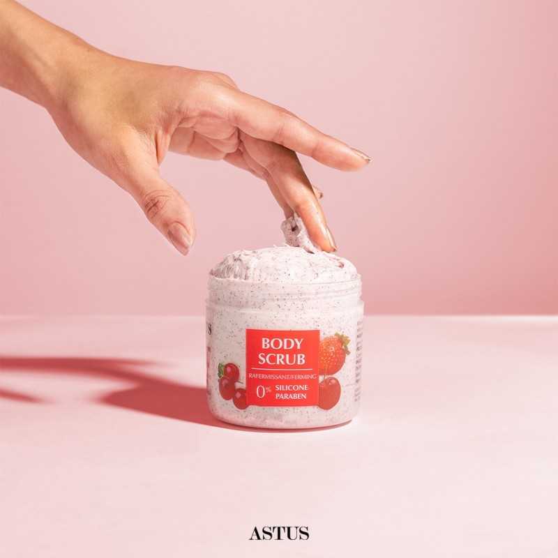 Gommage Corporel Hydratant ASTUS 250 ML Fruits Rouges est un soin raffermissant et nourrissant, enrichi en fruits rouges, conçu pour revitaliser et raffermir la peau.