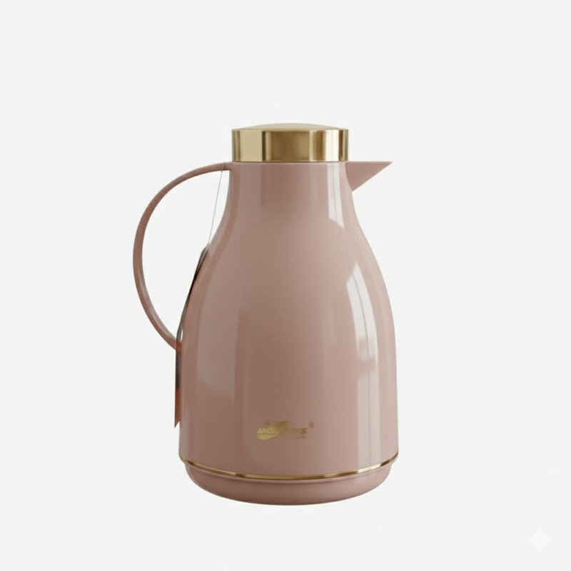 Thermos 1L Rose en polypropylène durable, avec couvercle étanche, bec verseur pratique et poignée confortable, idéal pour boissons chaudes ou froides et un transport facile.