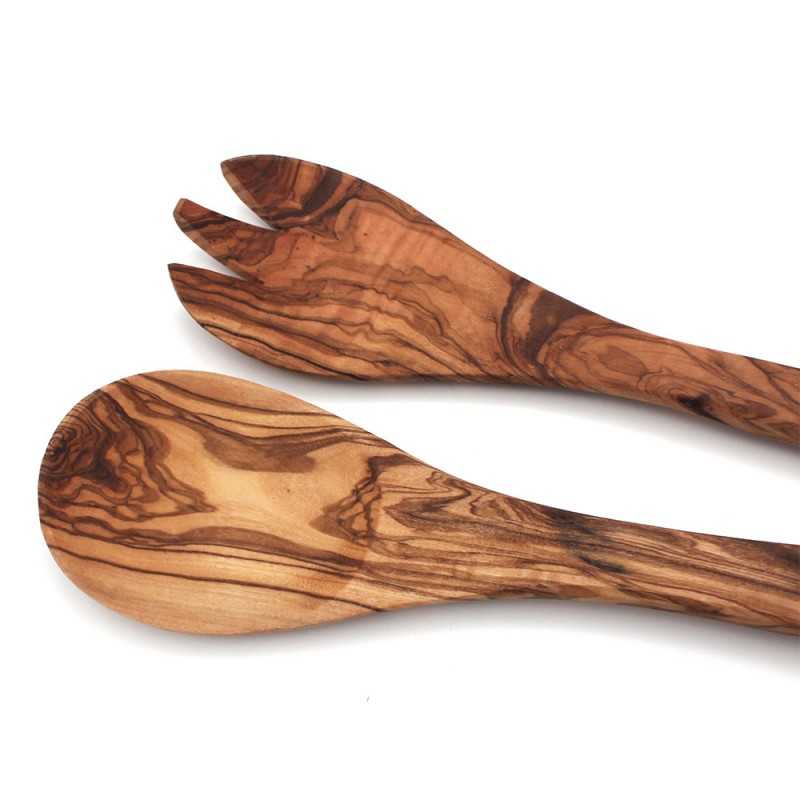 Couverts à salade en bois d’olivier, manches légèrement courbés (cuillère et fourchette) pour mélanger la salade et les fruits