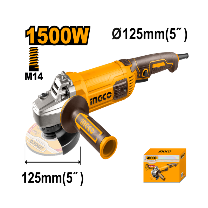 Meuleuse INGCO 1500W AG150028 : Puissance élevée de 11 000 tr/min et disque de 125mm pour un meulage professionnel performant et une durabilité accrue.