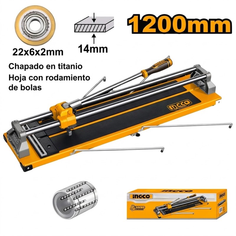 Coupe-carreaux manuel INGCO HTC12001 avec longueur de coupe jusqu’à 1200 mm et épaisseur maximale de 14 mm. Structure en acier robuste, système de coupe à roulement en carbure de tungstène pour une découpe fluide, précise et stable.