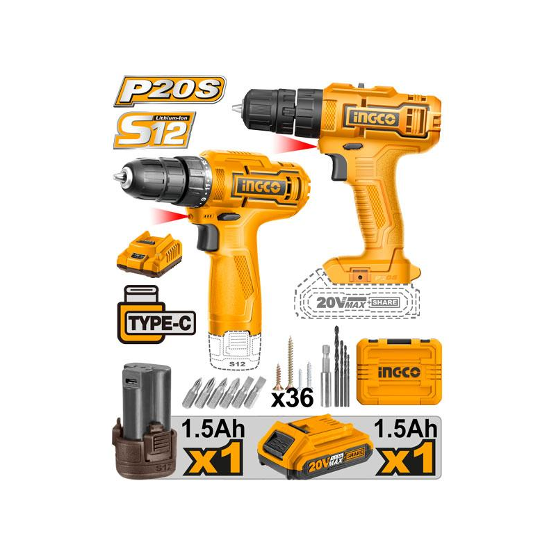 Kit INGCO CKLI20122 : Duo stratégique Perceuse 20V + visseuse 12V avec 50 accessoires pour une polyvalence totale sur tous vos travaux.