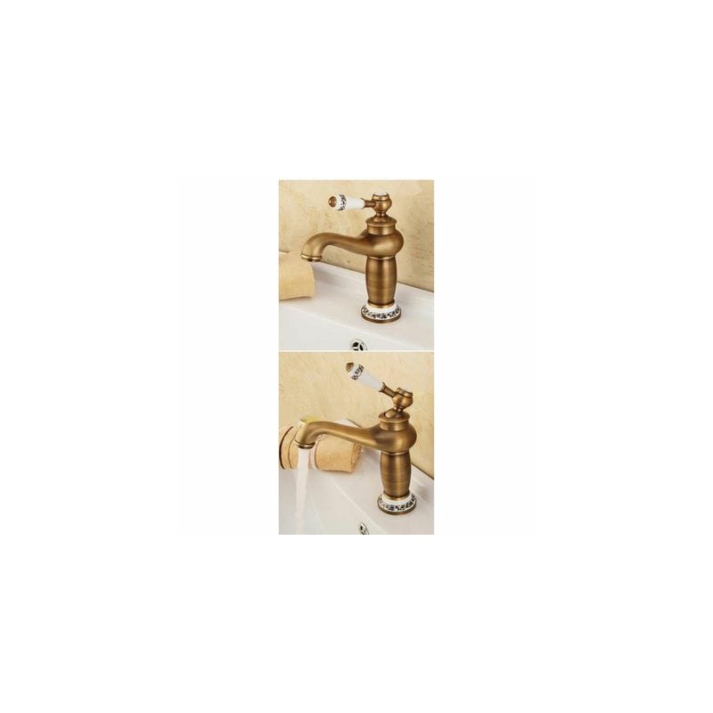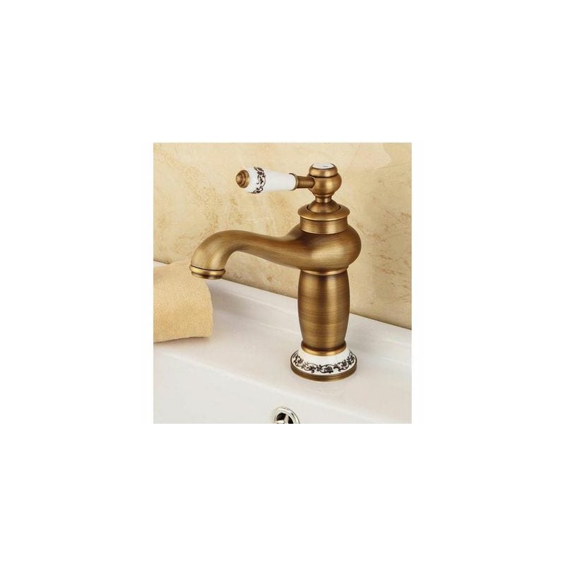 Robinet lavabo finition bronze vintage avec détails en céramique décorée. Parfait pour les ambiances classiques, rétro ou traditionnelles. Fabrication robuste, look haut de gamme, poignée confortable.