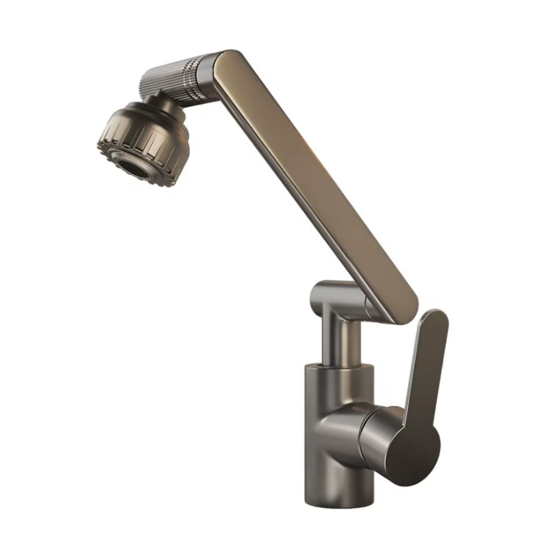 Mitigeur flexible bronze avec commande unique eau chaude/froide, bras articulé rotatif 360° et 2 modes d’eau (jet mousse et douche). Conçu en acier inoxydable avec cartouche céramique anti-fuite, idéal pour cuisine et salle de bain.