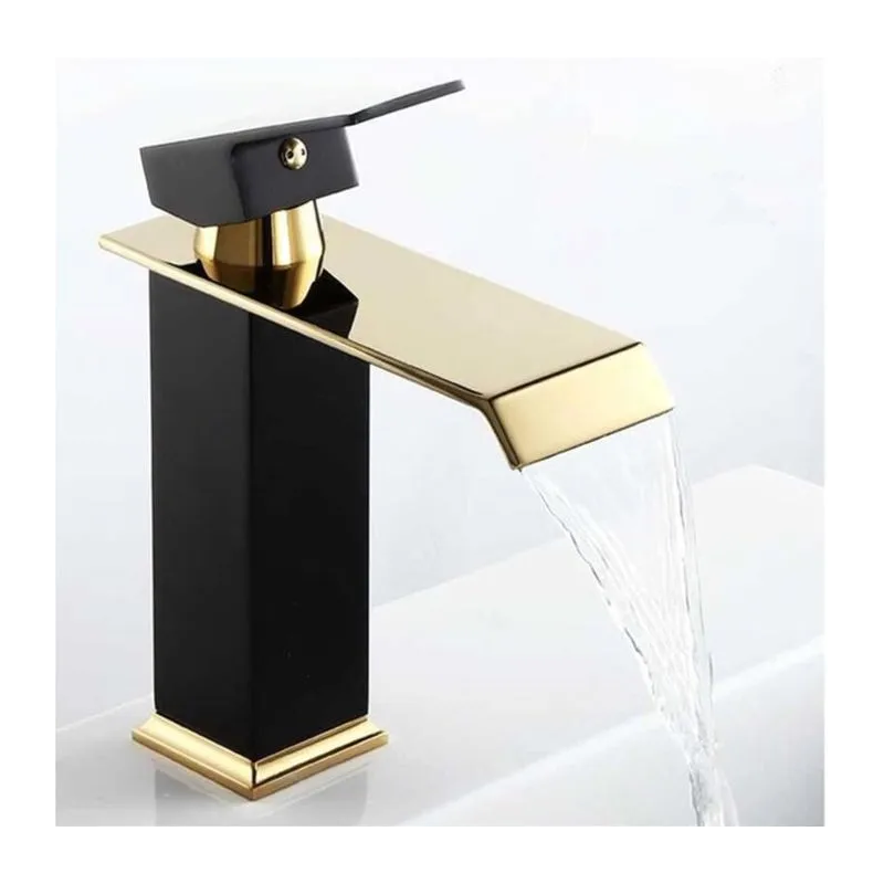 Robinet de lavabo Or et Noir en acier inoxydable, mélange eau chaude et froide. Hauteur 18,5 cm, largeur 17 cm, cartouche céramique durable. Poignée individuelle, installation facile avec 2 connexions et système de serrage.