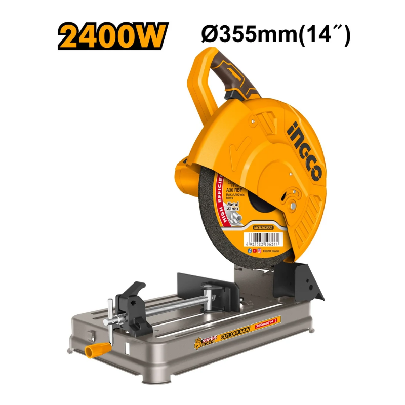 Scie à découper INGCO 2400W avec vitesse de 3900 tr/min et disque 355 mm. Conçue pour la coupe de métal (tube, acier carré, barre), elle offre puissance et précision pour les travaux intensifs. Livrée avec disque de coupe.