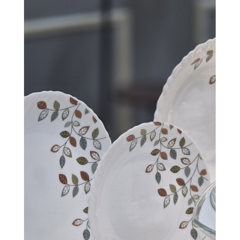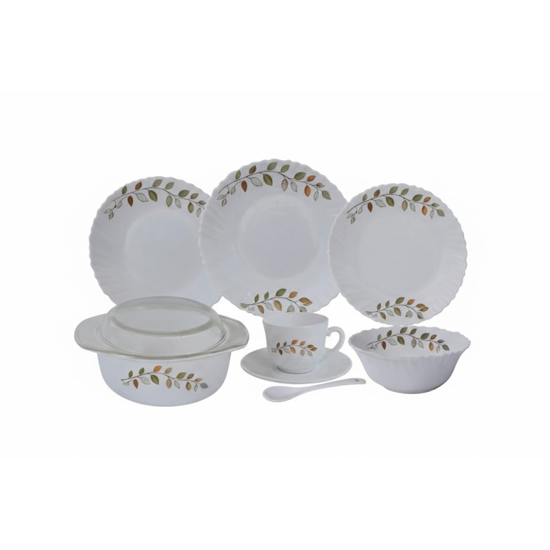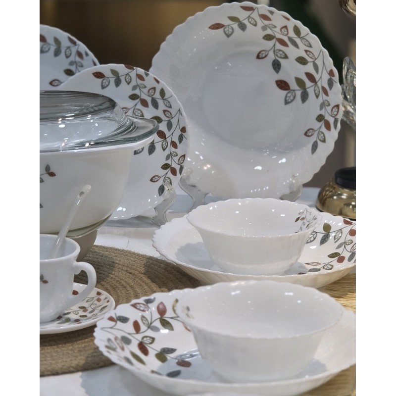 Service de table complet 44 pièces comprenant assiettes, tasses avec sous-tasses, bols, saladier, soupière avec couvercle et cuillères, idéal pour un usage quotidien et réception.