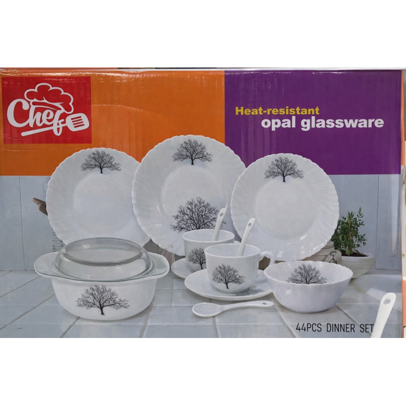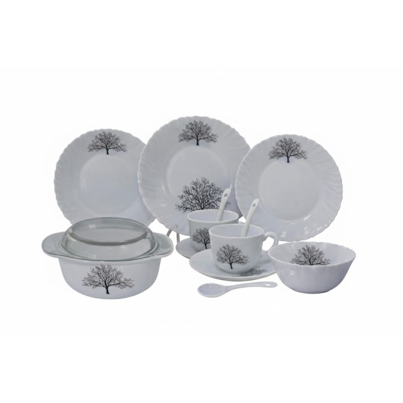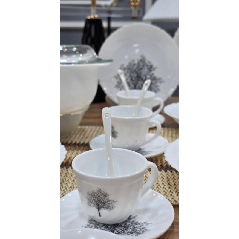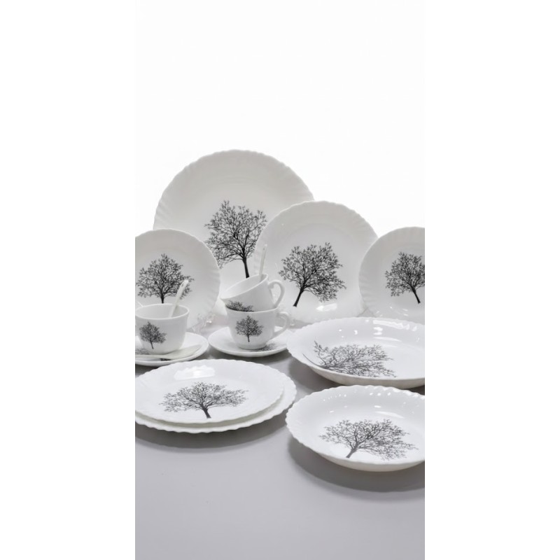 Service de table complet 44 pièces motif arbre comprenant assiettes, tasses avec sous-tasses, bols, saladier, soupière avec couvercle et cuillères, idéal pour un usage quotidien et réception.