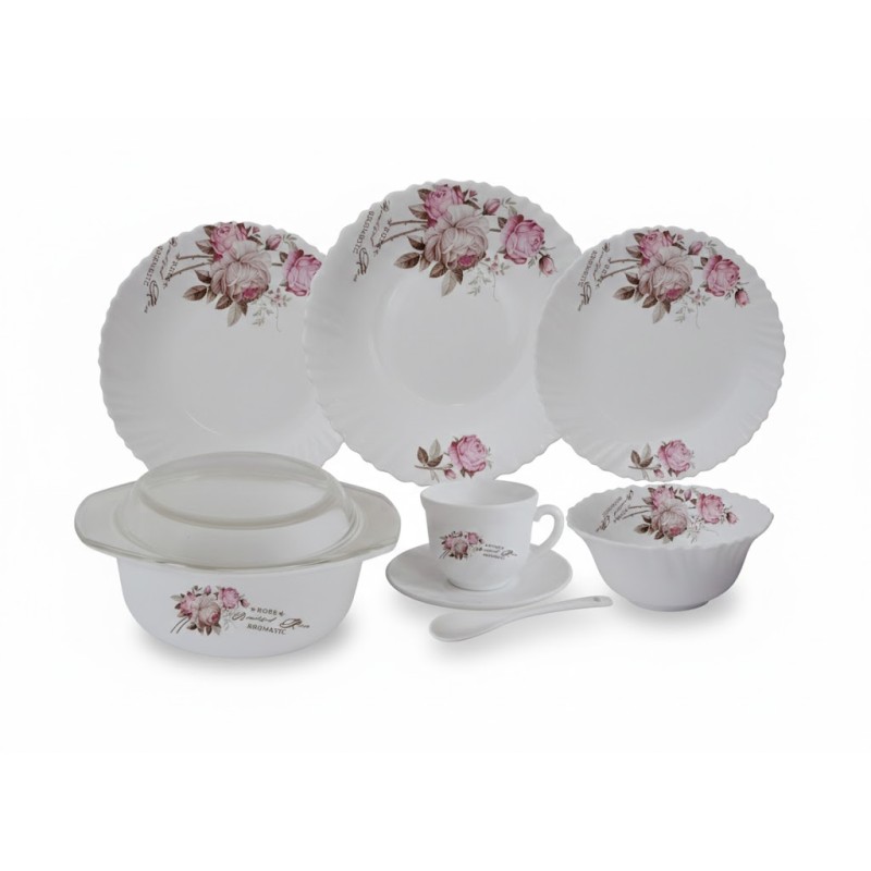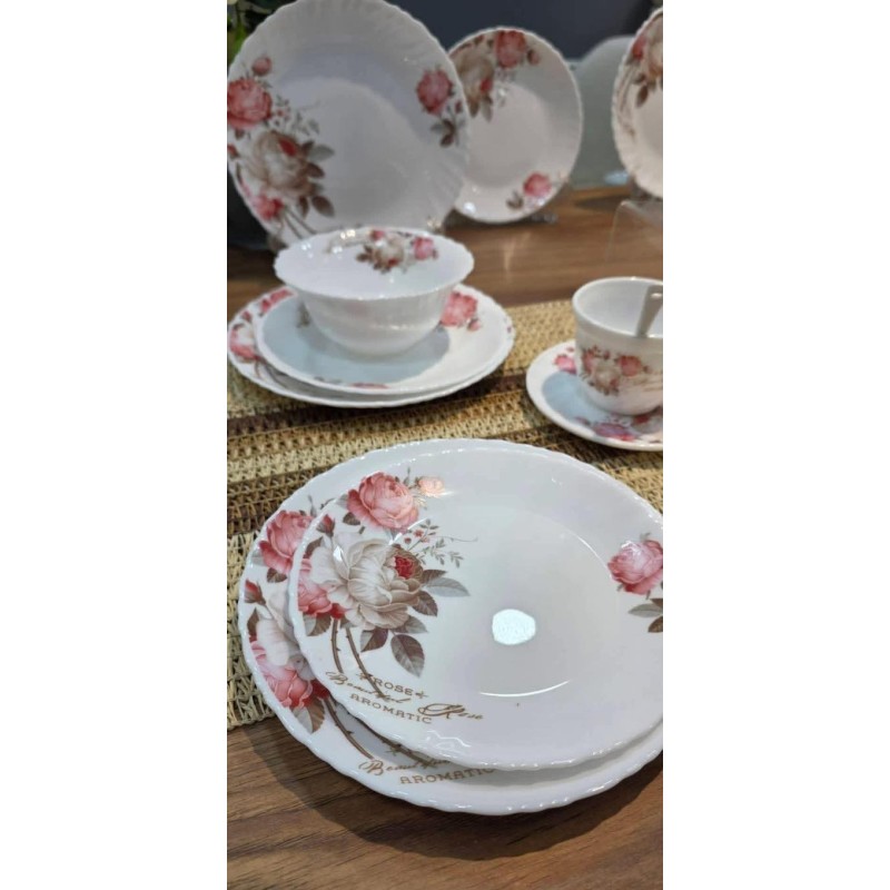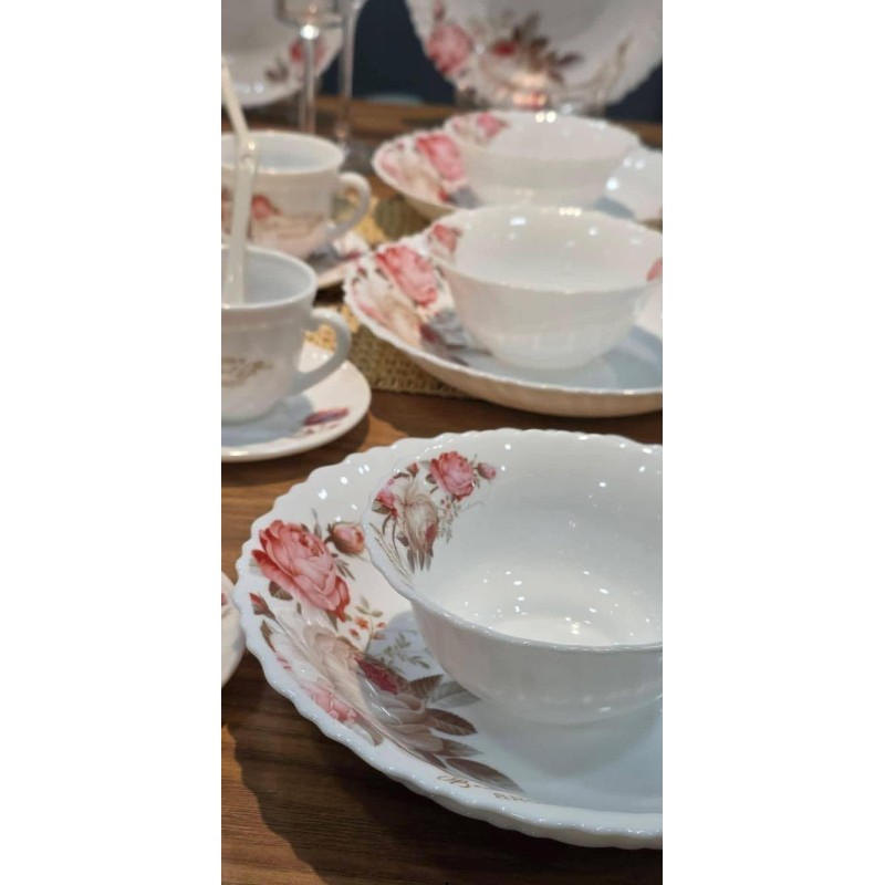 Service de table complet 44 pièces motif Fleur Rose comprenant assiettes, tasses avec sous-tasses, bols, saladier, soupière avec couvercle et cuillères, idéal pour un usage quotidien et réception.