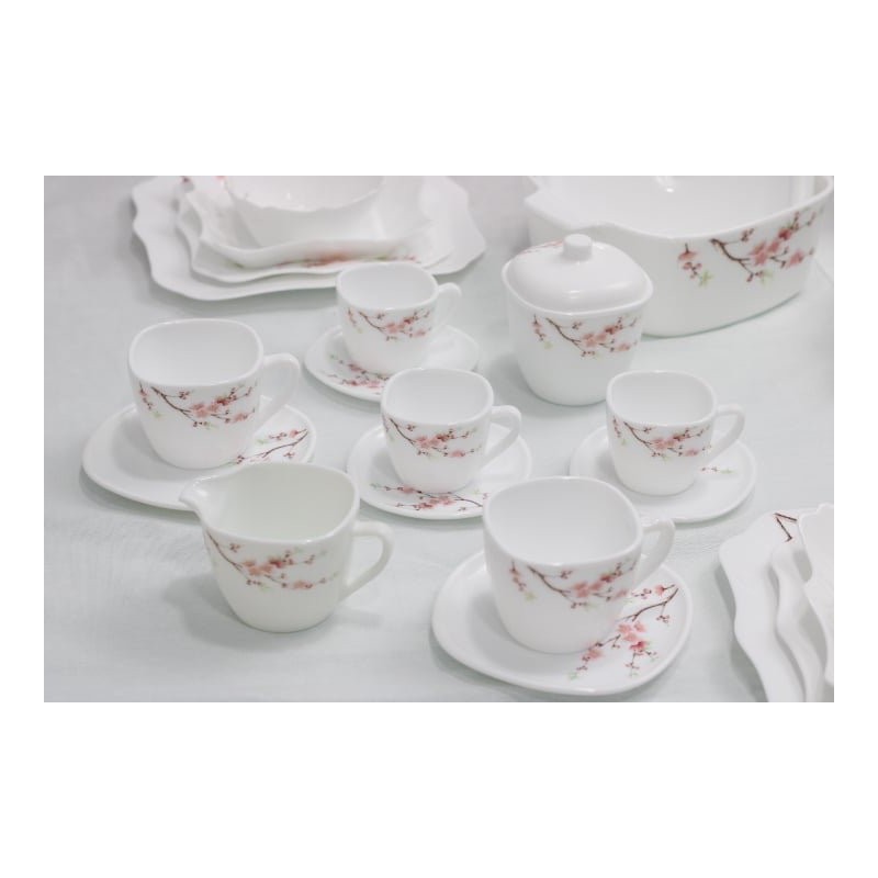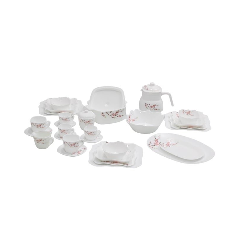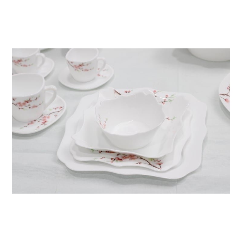 Service de table complet 72 pièces pour 12 personnes, motif fleur rose, incluant assiettes, bols, tasses avec soucoupes, ustensiles et accessoires pratiques pour repas complet.