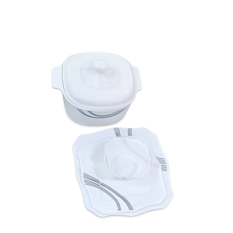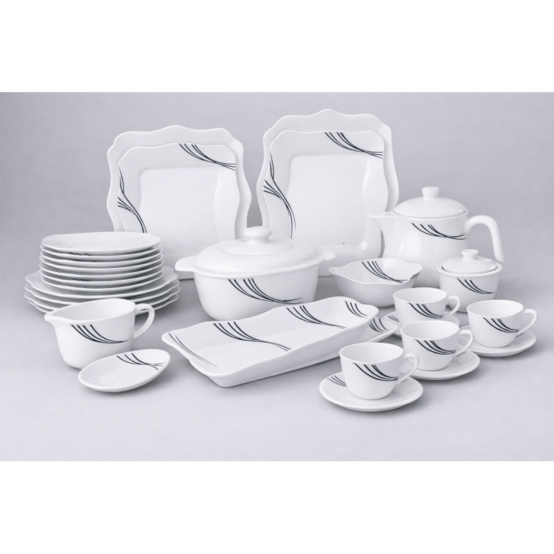 Service de table complet 72 pièces pour 12 personnes, motif Lignes noir , incluant assiettes, bols, tasses avec soucoupes, ustensiles et accessoires pratiques pour repas complet.