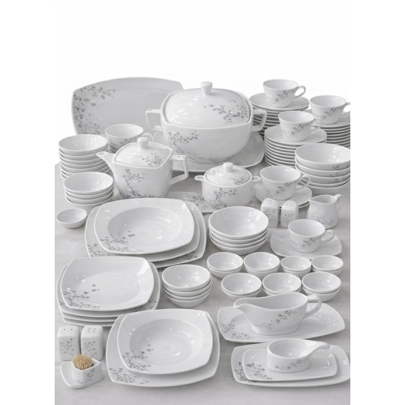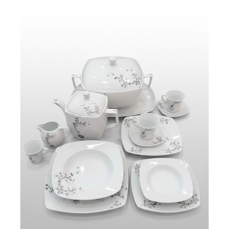 Service de table complet motif floral gris élégant comprenant 36 assiettes, 48 service café & thé, pièces de service et accessoires, idéal pour repas familiaux et réceptions.